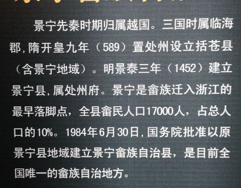 中国畲族博物馆在景宁县城(赫溪镇),2011年建成开放,不收费,也没人讲解中国畲族博物馆在景宁县城(赫溪镇),2011年建成开放,不收费,也没人讲解。旁边是畲族文化广场、及鹤溪。里面主要展示畲族的发展史和畲族文化。馆内灯光、背景音乐感觉不太明快,有些阴凉。