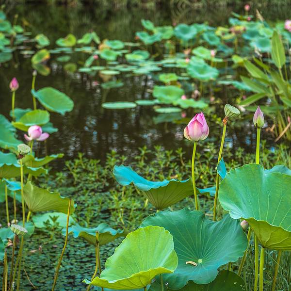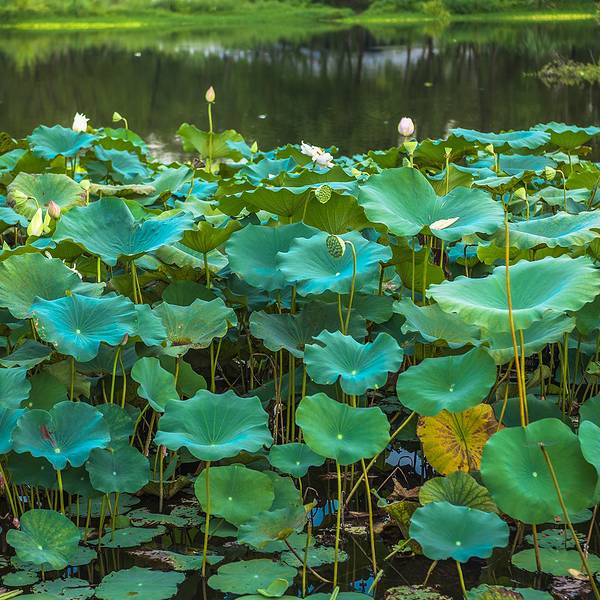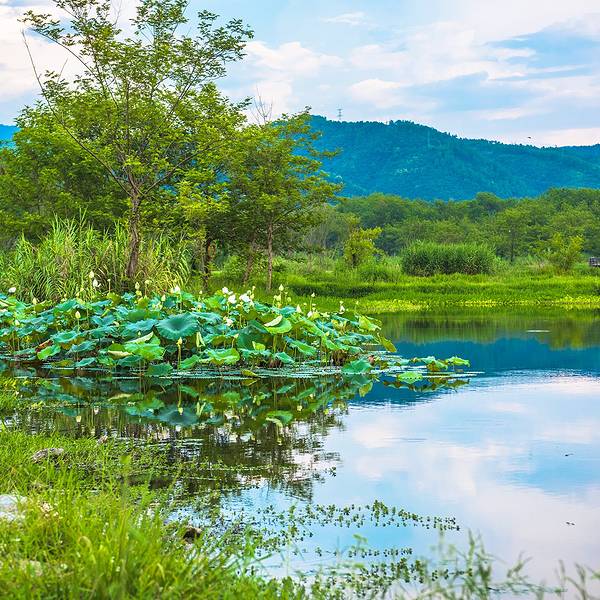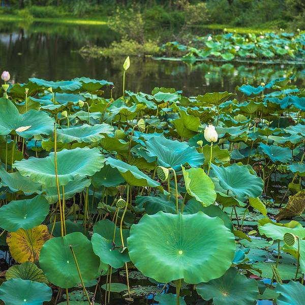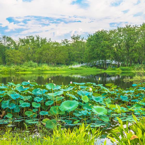 离开古堰画乡艺术小镇我们前往位于丽水莲都区的另一景点——九龙国家湿地公园。这是一个自然的生态湿地公园,面积比较大,风景也很美,生态环境很棒,游客也很少,值得慢慢走一走,逛一逛。走进湿地公园,没有了林荫的清凉爽适,却增添了湿地的寥廓和旷达。行至小路端头右拐,柳暗花明,眼前豁然开朗,碧波粼粼,浩浩敞敞,好一派宜人的水湖风光。湖边空气清纯的如同香精佳酿,吸一口进入肺腑,感觉神清气爽,目明身轻,真有脱胎换骨的味道。放眼望去,简直就是一片绿色的海洋!一片片荷叶,像撑开的一张张绿伞,“亭立”在碧波之上,绿叶之间,荷花竞相开放。有的洁白如玉,不施粉黛,自然白净,不沾一丝人间烟火味。公园里的垃圾箱做得十分可爱,是一只正在张大嘴的小青蛙。绿树和蓝天汇成一线倒映在水中写下“静谧”二字。小伙伴们纷纷拿起相机记录下这番美景。夏季,是湿地最美的时节。沿着蜿蜒的石板小路步入森林之中,顿感凉风习习,周身为之一爽,仿佛进入一个清凉神奇世界。
