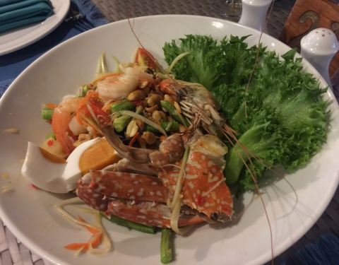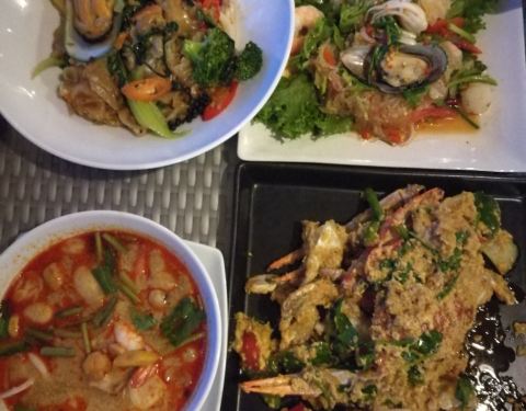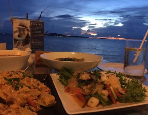 在沙滩露台酒店那栋下面,也就是海滩最西边。 环境,服务,VERY GOOD。 菜品: 1)咖喱螃蟹,2只很大的,味道超赞,价格很便宜。 2)冬阴海鲜汤,料很足,青口,虾,墨鱼,瑶柱,汤味道差了点点 ,配份米饭的。...在沙滩露台酒店那栋下面,也就是海滩最西边。 环境,服务,VERY GOOD。 菜品: 1)咖喱螃蟹,2只很大的,味道超赞,价格很便宜。 2)冬阴海鲜汤,料很足,青口,虾,墨鱼,瑶柱,汤味道差了点点 ,配份米饭的。 3)炒河粉,不推荐,不好吃,比不过广东的路边餐。 4)海鲜沙拉,料很足,配粉丝味道不错,就是蛮辣的。 5)饮品2杯,也很好喝。 总计1505泰铢。 具体环境菜品可看图。 PM 18:40 周三(20170809) 人不多很少。