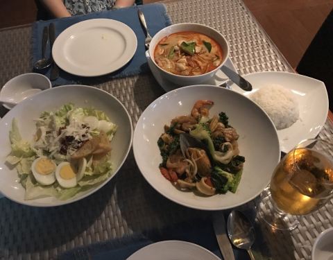 刚巧就在酒店楼下,去海滩必经之地,风景没有让人失望,伴着余晖赏心悦目,菜品也是很不错的,冬阴功、煎鲷鱼、海鲜河粉印象深刻