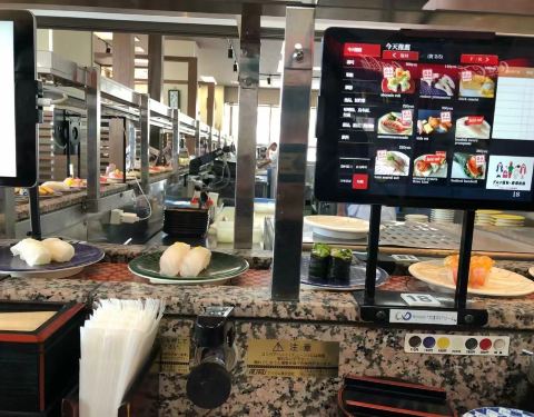 价格便宜,材料新鲜的回转寿司连锁店,美国村这家交通最方便。因为人气很旺,饭点过来很容易赶上排队。外观看起来有点陈旧,店内空间不小,可以选择坐在回转台自取或是使用电子屏点单,还有中文菜单哦。
