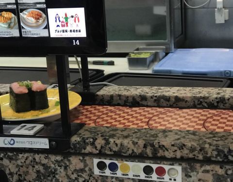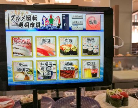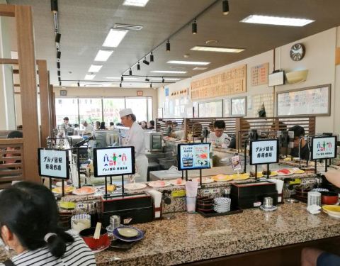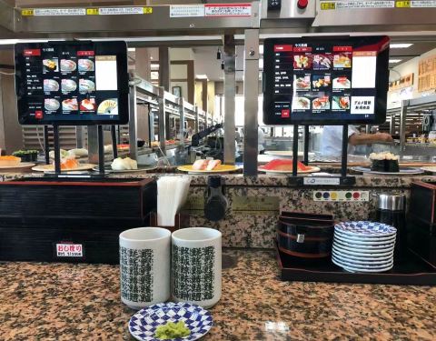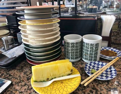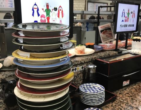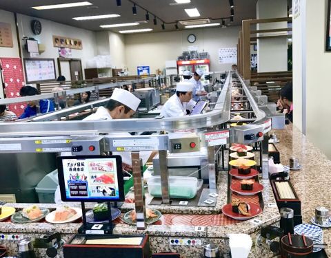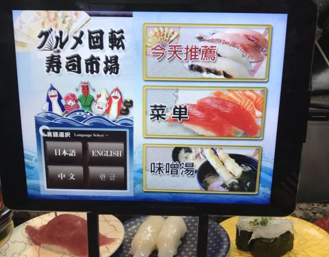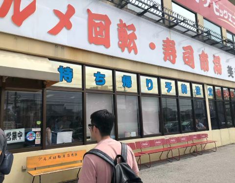 如果想要在冲绳选一家好吃又实惠的寿司店,却又在遍地的美食之间迷失,那大概是因为你还不知道这家店,否则,你一定会别无所求地直奔目标。 不收现金、下午2点多了依然排队叫号,人气火爆的餐厅就是这么不讲理的霸气。果断拿号排队,吹着冷气等美食。 餐厅大概3、4个四人位和一圈回转位,总共能坐四十人吧,排在我们前面的有十多个,饥饿的中午每一秒都是煎熬。 不紧不慢的日本人要等到桌子清理干净后过几分钟才会叫客人落座,不知是有特别的讲究还是已经忙不过来了。 规矩和国内一样,寿司等食物按照餐盘颜色的不同区分不同价格,最低的每盘110日元,最贵的每盘360日元,回转餐盘的食物随便取用,另外也可以专门点餐。桌上餐具餐盘酱油芥末抹茶粉餐巾纸一应俱全。 这里最大的亮点莫过于有着四种语言(日中韩英)的点餐PAD。点餐器每人面前都有一个,屏幕简洁易操作,只要在首界面选好语言后面就都易如反掌了,单点的食物很快就会送到客人面前。 已经饿到不行的我们依然保持了冷静——没有取用过多最贵的红色餐盘的寿司,主要以中等价位为主,当然最便宜和最贵的本身也是少数,生怕空空如也的肚子一不留神就伤害了钱包。 这里的所有食物(除了冰淇淋)都是现场制作,没有冰碴制造冰鲜效果,一切都是最原汁原味的口感。厨师们就站在回转餐台中间,每一步操作都清晰可见,绝对吃着放心。 除了各式秀色可餐的寿司,还另外单点了海鲜汤、冰激凌、军舰卷等乱七八糟的一大堆,五颜六色的餐盘餐碗堆起来也有差不多十六七个将近三十厘米高,完全没有控记住我们寄几,就是吃了这么多,当走到收银台结账时,惊讶的发现这一顿竟然才花了2980日元,人均还不到100块,性价比超高有木有!