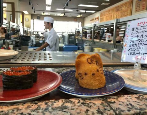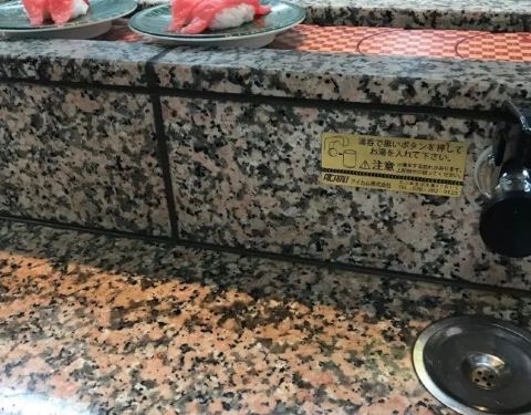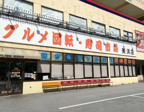 グルメ回転寿司市场 (美浜店) 都说中国人去的多的基本上日本人就很少,这家也是无不例外,位置在美国村,58号公路就在附近。外面招牌很大,出入美国村就可以看到。 桌上有酱油,配置自助点单的,像金枪鱼大脂,鳗鱼寿司,汤品都需要自助点,点好单有自动小车子送到你桌前,按个扭就回去了。其他的寿司都是回转轨道上自己拿着吃,当然也可以机器点菜。 味道还是相当不错的,东西蛮新鲜的,尤其是鳗鱼寿司,整个放入嘴巴,鳗鱼在米饭里爆浆,超级爽,点了都是价格比较高的,捏的不算恭维,不过没有破坏食材原始的味道。米饭味道也是有点冷。