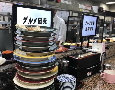 グルメ回転寿司市场 (美浜店) 都说中国人去的多的基本上日本人就很少,这家也是无不例外,位置在美国村,58号公路就在附近。外面招牌很大,出入美国村就可以看到。 桌上有酱油,配置自助点单的,像金枪鱼大脂,...