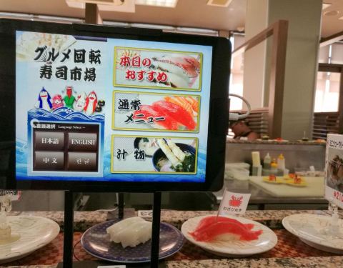 グルメ回転寿司市场 (美浜店) 都说中国人去的多的基本上日本人就很少,这家也是无不例外,位置在美国村,58号公路就在附近。外面招牌很大,出入美国村就可以看到。 桌上有酱油,配置自助点单的,像金枪鱼大脂,...グルメ回転寿司市场 (美浜店) 都说中国人去的多的基本上日本人就很少,这家也是无不例外,位置在美国村,58号公路就在附近。外面招牌很大,出入美国村就可以看到。 桌上有酱油,配置自助点单的,像金枪鱼大脂,鳗鱼寿司,汤品都需要自助点,点好单有自动小车子送到你桌前,按个扭就回去了。其他的寿司都是回转轨道上自己拿着吃,当然也可以机器点菜。 味道还是相当不错的,东西蛮新鲜的,尤其是鳗鱼寿司,整个放入嘴巴,鳗鱼在米饭里爆浆,超级爽,点了都是价格比较高的,捏的不算恭维,不过没有破坏食材原始的味道。米饭味道也是有点冷。