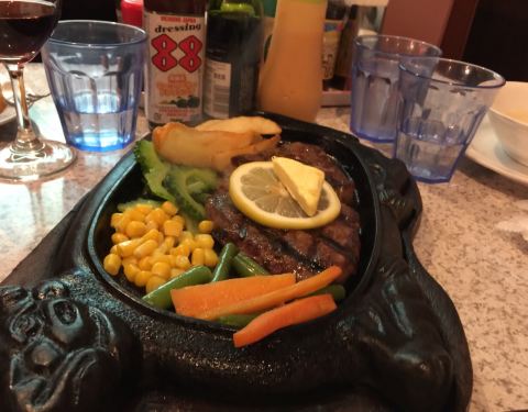 冲绳当地的牛排连锁店,这家位于小马路上,相对安静,店内食客以当地人为多,提供儿童套餐,很可爱,有土豆色拉,炒饭还有香肠,来冲绳当地有名的石垣牛肉不可不尝,石垣牛菲力牛排煎的恰到好处,很嫩,鲜美多汁,平日不太爱牛肉的我也忍不住多吃了几口,肉的香味一直在舌尖环绕,牛排套餐配的前菜蘑菇汤也很地道,汤底浓郁不腻人,牛内脏做的入味且无半点腥味,好吃到哭,另外它家也提供冲绳本土料理,炒苦瓜之类,炒苦瓜一点都不苦,入口没有涩味,很健康。