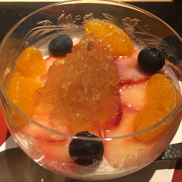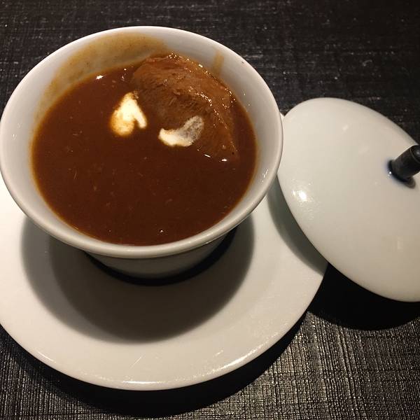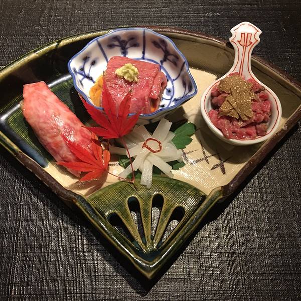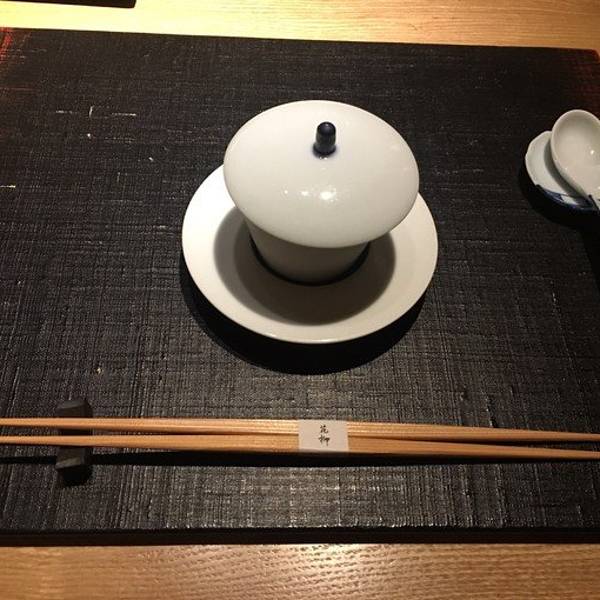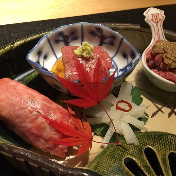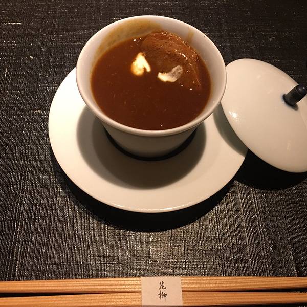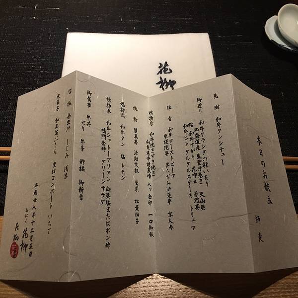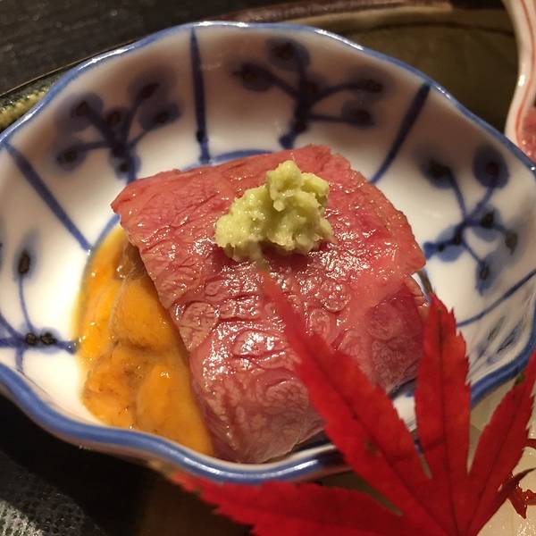 花柳这家店原名叫然,具体位置:〒103-0024 Tōkyō-to, Chūō-ku, Nihonbashikobunachō, 11−11-11, K1ビル1F,是吃和牛料理的一家米其林一星餐厅。从三越前站大约需要走8分钟,从神田站则需要12分钟时候。不太难预约,但还是记得提前约,我约到的是9:45晚上,好晚,但为了吃,吃货什么都不怕,可以说是无所畏惧。店铺座位不多,除了主厨,我只看到了2个店员,所有菜品都由主厨完成。店里的装修是木质日式一门包厢和3个围绕的席位,简洁不封闭却又感觉有了单独的空间。白底黑字的餐巾及和纸印刷的菜单也很符合我的心意~牛舌炖煮 里面有天山葵,昆布,菊花芜等,配了淡淡的咖喱点缀了一些芝士,牛舌很兰,易嚼,咖喱味道不重与牛舌的嫩滑可谓是相得益彰,也很开胃暖心。扇形的盘子很有感觉,点缀着秋天的枫叶和松针,里面是三种不同做法的牛肉刺身,牛肉寿司,牛肉海胆与牛肉粒配松露。其中我最爱的是牛肉粒配松露,牛肉粒有很快炙烤过的表面配上松露的香味,特别令人回味。寿司不是不好吃,只是对于我这个胃小的人来说,一个小饭团也是很占地方的。海胆加生牛肉,就是海陆结合的美味,海胆原有的甜味,加上牛肉和一些酱汁,没法形容,就是好吃牛肉真是很容易饱,吃到这里我就感觉虽然忍不住还想吃,但确实有点饱腹感了。这个是炙烤的牛肉,配着白萝卜,胡萝卜和聖護院蕪。肉质不用说,看着图片就知道有多嫩,多美味,绝对没有什么塞牙缝的感觉。蓝色瓶子里是寿喜锅的调料,可以放一些在生鸡蛋里,我只是想夸一下这个瓶子上的青蛙或者蛤蟆,丑萌丑萌的这个可以算是精品寿喜烧吧,哈哈哈。一片很大很大的薄片配上生鸡蛋,一半鸡蛋用来蘸肉,另一半就可以浇在饭上也是别有一番味道啦,就是不知道国内不吃生鸡蛋的小伙伴们,能不能接受,其实没有什么鸡蛋的腥味,口感也没有什么特别奇怪的感觉,大家不妨试试看喽。牙签盒,只是觉得好看就拍了一下蟹肉丸子汤,薄片白萝卜遮盖着,朦朦胧胧的感觉挺美的,一根莺菜以及松野柚子,汤上漂着少量蟹黄的油,味道清淡,蟹肉有弹性,肉质鲜嫩,收住了原有的味道,在吃了几道肉料以后,让我已经满满的胃流入了一股清流,这个季节的蟹不用多说,都是好食材。这道牛舌,盐,柠檬,不用多说什么文字,烤至半熟的状态,不薄不厚,不是入口即化,而是弹性十足,配上一些柠檬与盐,恰到好处。沙拉,也让自己的味觉做了适当的调整,均衡了营养。吃到这里,我的胃是真的饱了,可是这肉质,这颜色,这嫩度,就是冒着胖的危险也要吃下去呀,不要拿一般连锁的肉质来比,这个绝对是A5的肉,好吃到没办法形容,很饱很饱的我也没有放弃吃的机会。草莓,橘子,蓝莓做的牛奶布丁,奶味香甜较浓,不甜不腻,餐后我的甜点胃得到了满足,最喜欢吃奶味足,口感粘稠的布丁类甜点了。总之一句话,去吃,不用犹豫,而且管饱。