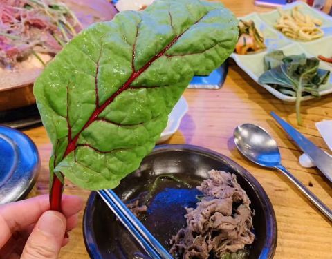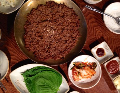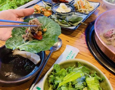 韩国老字号的店铺,满墙的明星食客签名。招牌菜韩式烤肉饼,碳香扑鼻,肉汁咸甜。肉饼中参有荸荠,使口感更佳。其他小菜也爽口下饭。