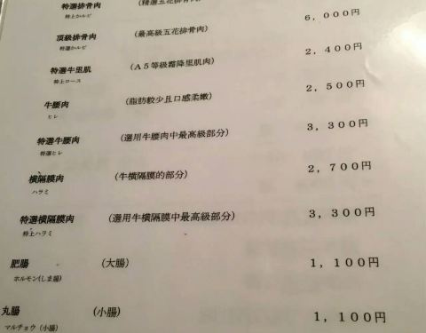 到达牛皇,最先看到的是门口一堆牌照,经验证明,有这么一堆奖牌的,应该质量是比较可靠的。进餐的地方是一个个用布头隔断的小包间,环境有点暗,到这儿来是吃肉的,所以主要看的第一页菜单,有中文。最后点了最高级五花排骨肉一份,牛肉刺身一份,牛舌一份,一碗米饭。牛舌虽非常嫩,牛肉刺身也非常好,吃起来像肥脂冰淇淋的感觉,一点也不费牙,又很有肉香,没有过多的调料,服务也不错,按铃后马上就到。需要注意的是服务费收取10[%],还有包房费500日元,也未提前说明,菜单上不注意就看不到,不知道是不是都这样子。