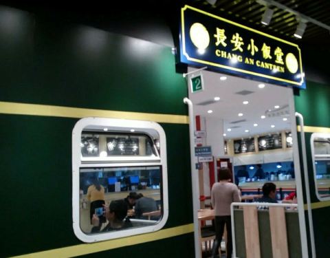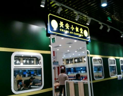 【环境】长安小饭堂的装饰非常有特点!是以绿色列车的形象来装饰的。首先,火车头唯妙唯肖,还挂了大红花!其次,做了车箱,内部的座位也是按列车上的座位设计,赞。 若得美食,当愿众生,满足其愿,心无羡欲。