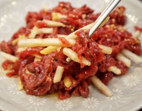 "肉"香不怕巷子深,位于有名的广藏市场旁的一条胡同里,低调又亲民。最有名的就是生拌牛肉,切成细条的甜梨搭配上经过秘方腌制的生牛肉,再打上一个生鸡蛋黄,不仅营养上大补,而且口感上,有一点冰冰的感觉,不咸不淡,越嚼越香。