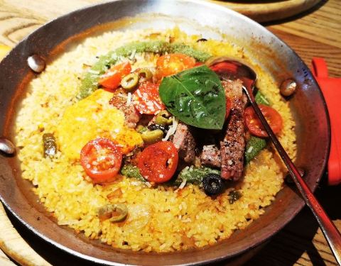 工作日中午和小伙伴相约吃午餐。搜了下离公司较近的餐厅,不约而同选了这家。点评上有99元/2人的午市套餐,性价比满高的。 【环境】有两层,西班牙的装修风格。 【罗勒牛排海鲜饭】口味不错,饭的软硬程度正好。 ...工作日中午和小伙伴相约吃午餐。搜了下离公司较近的餐厅,不约而同选了这家。点评上有99元/2人的午市套餐,性价比满高的。 【环境】有两层,西班牙的装修风格。 【罗勒牛排海鲜饭】口味不错,饭的软硬程度正好。 【芝士蜜桃鸭胸色拉】量超大,鸭肉很嫩,还配有黄桃、番茄、无花果等蔬菜。 【饮料】和小伙伴都选了鲜榨果汁,苹果+胡萝卜的搭配,口味不错,连不吃胡萝卜的小伙伴都很爱。