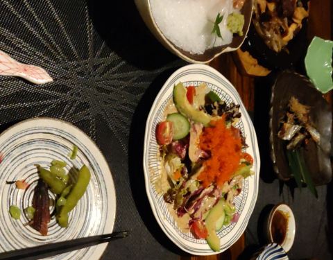 - 刺身拼盘,有三文鱼北极极贝,很新鲜。牛油果沙拉还可以,味道很赞