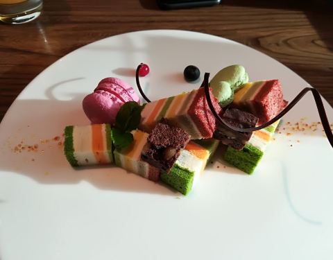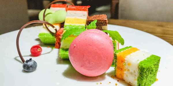- 彩虹甜点非常好吃,说是各种颜色都是纯天然的食物做的,上面还有一个小小的马卡龙蛋糕,吃完很有满足感