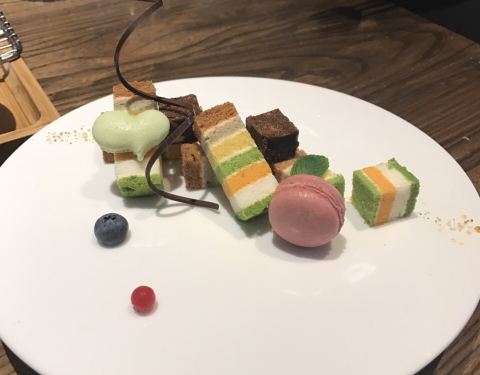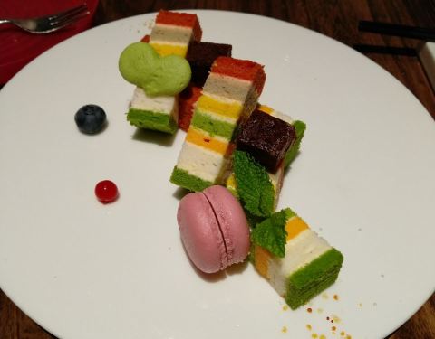 彩虹甜点非常好吃,说是各种颜色都是纯天然的食物做的,上面还有一个小小的马卡龙蛋糕,吃完很有满足感