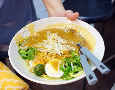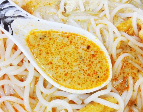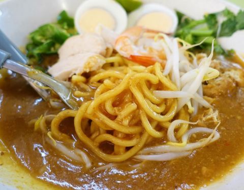 他们在叻沙很有名气,哦,还有人慕名而来,要排一小会儿队才能吃得上呢。但是饭桌速度非常快,他们家的叻沙里面有一股沙茶酱的味道。