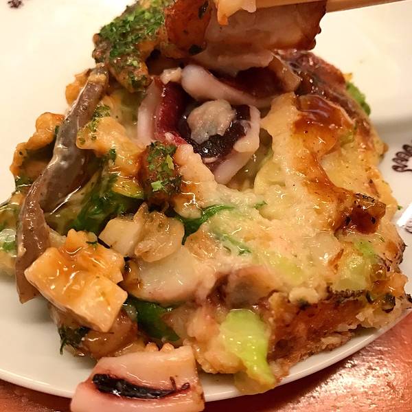 晚饭我们定在了大阪梅田吃,会席早餐让我们这会儿才刚刚有点饥饿的感觉。从大阪站搭乘JR线,20多分钟就可以到达梅田车站。お好み焼 きじ位于梅田空中庭院地下一层,店不大,却非常火爆。现在口碑逐渐传出去了,我...晚饭我们定在了大阪梅田吃,会席早餐让我们这会儿才刚刚有点饥饿的感觉。从大阪站搭乘JR线,20多分钟就可以到达梅田车站。お好み焼 きじ位于梅田空中庭院地下一层,店不大,却非常火爆。现在口碑逐渐传出去了,我们去的时候已经在排长龙了,店里跟我们一起用餐的客人有来自中国的,有欧洲的、泰国的,因为排队时服务员就会问你来自于哪里,然后说一句客人的母语,大概就是欢迎光临,你好这类的语言。店里有一个妹子会说中文,所以去了无压力。店里有四人座也有吧台座,坐吧台的话可以亲眼看见大阪烧的制作过程哦~~~墙上贴满了客人对这里的好评及祝福的小纸条我们选择了吧台座好烧我们选了一份Mix,单有海鲜、牛肉和猪肉的大阪烧,MIX就是三种肉类全包含最右边那个就是我们点的MIX混合,包含各种海鲜食材、五花肉三片、牛肉屑等;最左边的两个是猪肉的,单点猪肉的话包含5片五花肉;靠近大厨方向的那个是海鲜味道的,所以料足与否一眼明朗,建议大家如果没有忌口,就选择MIX口味。撒完料后,大厨就会把大阪烧翻过来,把肉料煎熟。煎熟后再翻回来刷酱。当把肉翻到铁板那面时,铁板发出兹拉兹啦的声响,香味一下扑鼻而来,等待的过程开始变成了煎熬。酱刷上之后,食欲大增!!!我们两个人点了一份MIX大阪烧,点了一份混合炒面。都做完之后,大厨会一样切一半拼好,分别盛到你面前的铁板上。吃的时候用铲子切开放进自己的盘子里面就可以啦~~~吃的时候一直在感叹,这才是大阪烧啊!!料足的导致盛到盘子里就快散开了。海鲜吃出了完整的大虾、鱿鱼段、海参,其他就是猪肉和牛肉,蔬菜有圆白菜。酱汁刷的很到位。将上面刷好酱的外皮掀开,里面丰富的肉料散发着鲜香,垂涎三尺!!!