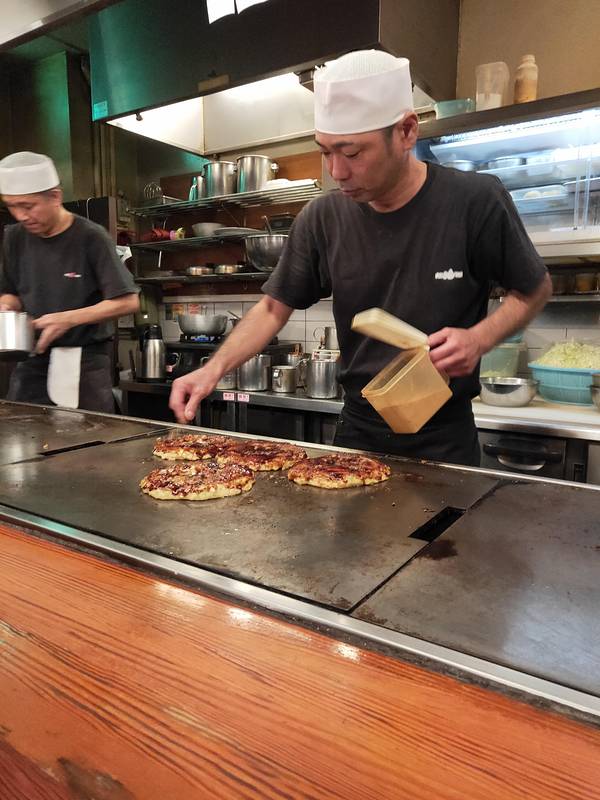 来大阪怎么能不吃大阪烧?这家店是各种软件上都推荐的,口碑很不错。但就是不太好找,也是在地下负一层,店面很小,我们两个在里面转了很久才找到。排队等了30分钟,我们很幸运地轮到吧台的位置,可以近距离观看...