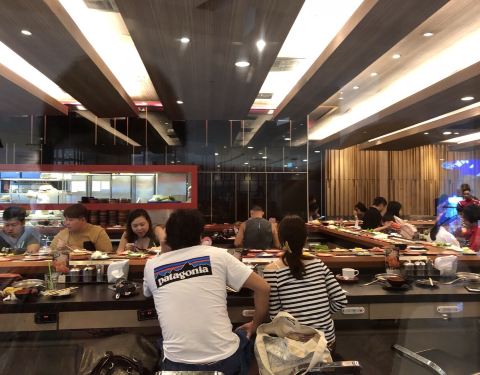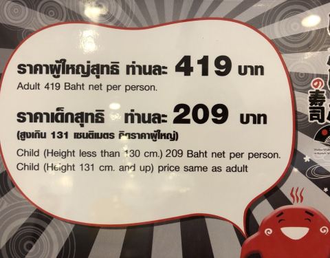 日式自助餐,有寿司,关东煮,还有旋转火锅。1.3米以下小孩免费,大人419泰铢,1.3米以上的小孩是209泰铢。很划算。