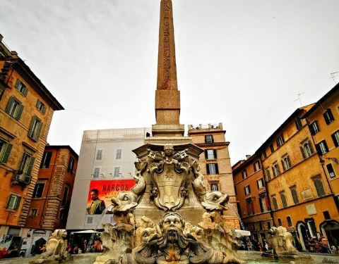 万神殿门口就是这个叫罗通达的广场,它的方尖碑非常醒目,下面还雕刻着罗马的神话,还有一个喷泉也不错,可惜我们去的时候是下雨天也没有好好看。