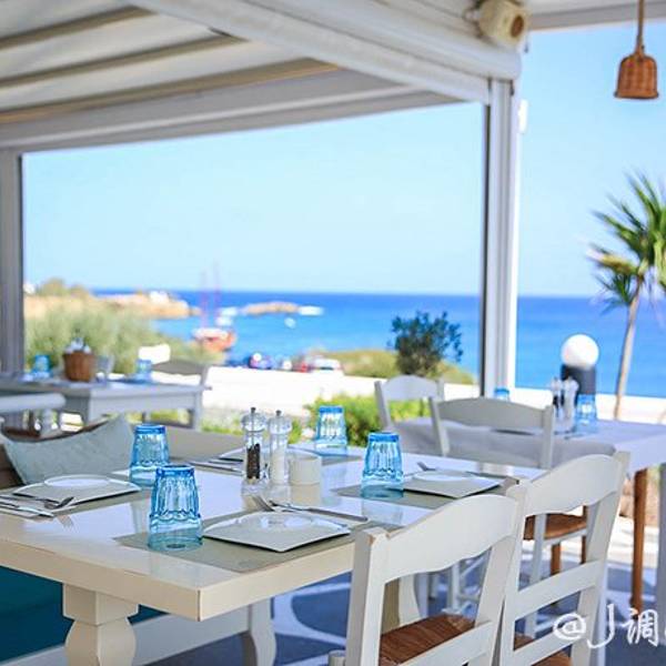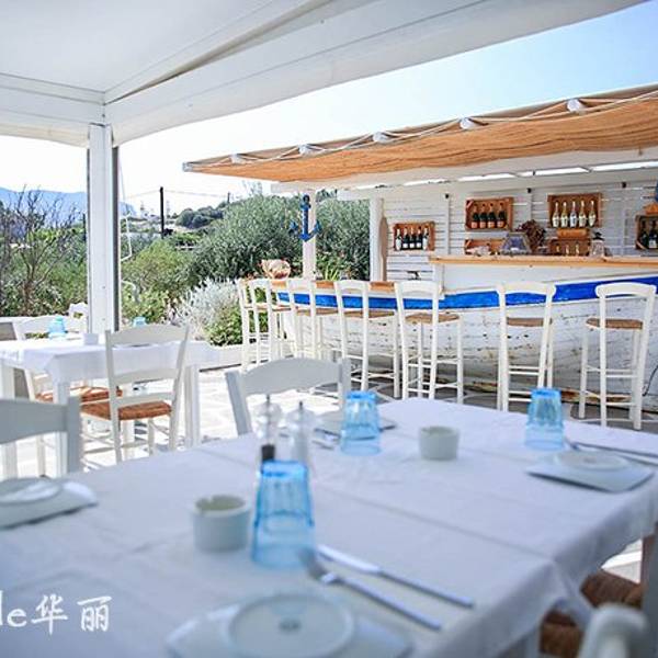 Saradari Restaurant是一家露天海景餐厅,蓝白的地中海风情,最特别的是船型的吧台,有…