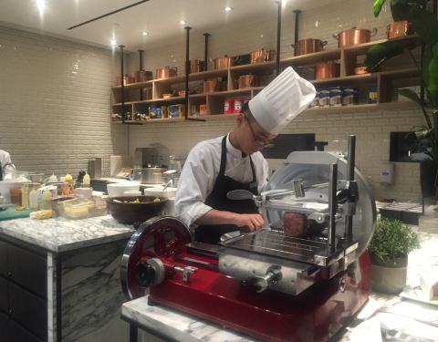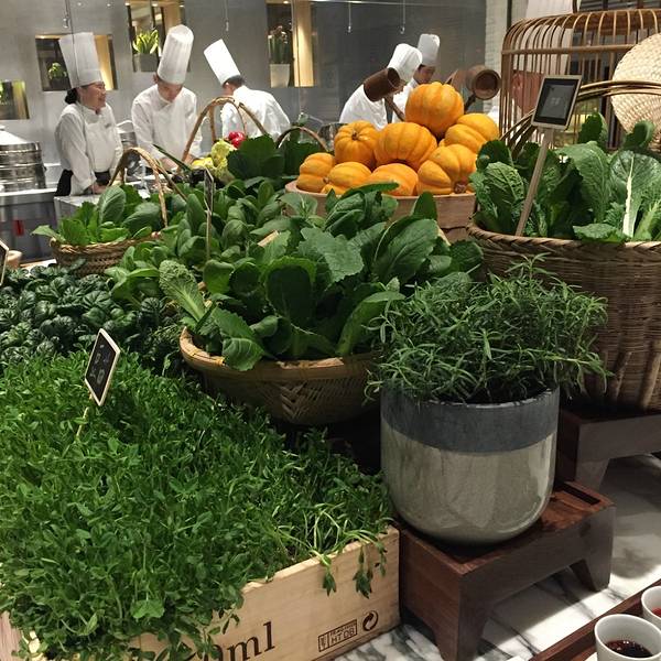 杭州柏悦是由YP设计公司设计的,潮餐厅的设计也十分符合其定位与命名。整体设计偏淡色系,给人感觉十分敞亮。餐厅的厨房为完全开放式厨房,所有的菜品都在你的监督下完成。餐厅最大的特色也是目前最最流行的,蔬果类都是绿色有机的,就像早餐,少却精。潮餐厅没有具体的菜系定位,有中餐,有粤菜,有意大利菜,以意大利菜和西餐为主。