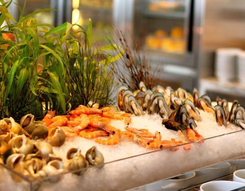 杭州柏悦酒店48楼的潮餐厅,一边是餐厅,另一边到晚上是酒吧,非常有名的地方。我们预订了周日的自助午餐,需要提前预约的,订了靠窗边的景观位,风景是没话说了。环境非常好,坐在景观位,一览钱塘江风景和周边高楼大厦,感觉非常好。就是吃的一般般,餐点品种不多,海鲜类不多,都是以肉为主,在这里就是吃个环境吧,人还是很多的。
