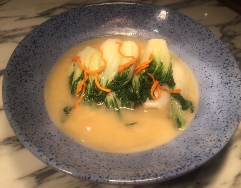 【北京烤鸭】主厨为我们提供的烤鸭三吃。潮餐厅的烤鸭深受很多食客的喜爱,烤鸭也确确实实是木炭炉子里烤制的,保证了烤鸭的品质与口感。首先是第一吃,有厨师会专门为你片鸭子,十分专业。第一次的片鸭子分为三盘,一盘纯皮,蘸少许白糖,香脆可口。第二盘是皮与肉的结合,用这部分包来吃。第三盘是纯肉,烤鸭肉十分细腻,不柴很好吃。第二吃是煮汤喝,简直是非常完美的烤鸭汤。烤鸭汤用高汤熬煮,里面加了豆腐鱼小白菜,清淡中带有香味与鸭香,十分美味。第三盘是避风塘炒鸭架,香酥口感,值得一试。