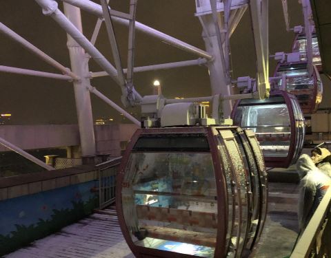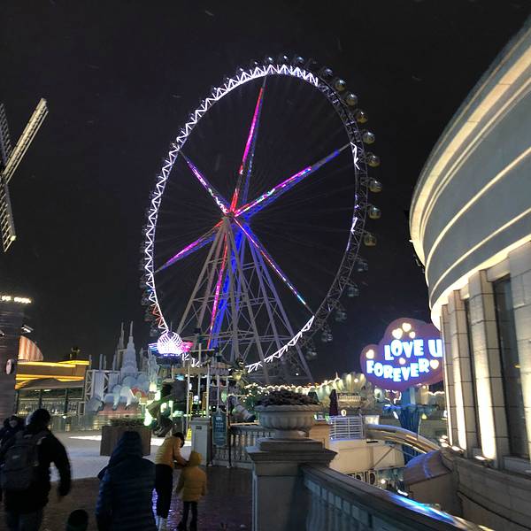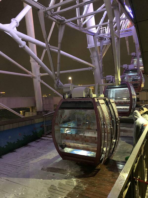 但是要说到江南环球港最吸引人的地方,不是装饰、不是美食,也不是购物,而是江南环球港的游乐项目,其中最有代表性的就是世界港口小镇,最有名的项目就是江南环球港顶层露天区域的摩天轮。我们去的时候正好是下雪,摩天轮存在停运的可能性,所以工作人员就建议我们微信购票,如果停运的话,是可以退款的,一成人是60元,身高120以下的孩子是免费的。大概在等待了将近一个小时候,我们终于乘上了摩天轮,比较特殊的是,摩天轮的众多舱位中,有12个舱居然还带有K歌功能。摩天轮转一圈大概是20分钟左右的时间,夜观常州下雪的景色也还挺有意思的。 展开