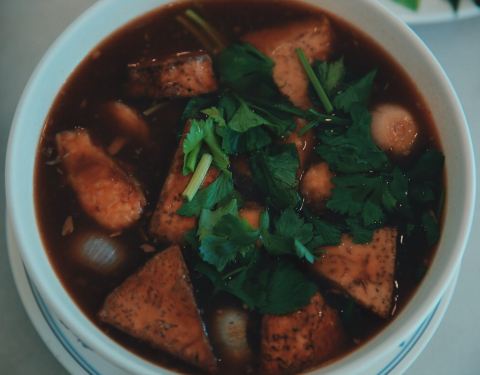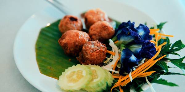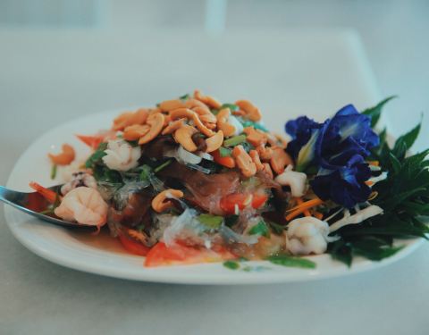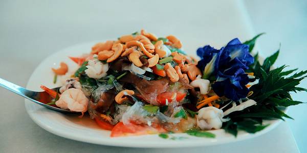 黑白主调的现代简约风设计,线条简明硬朗,整洁大气、安静端庄地坐落在甲米塔拉公园附近。餐厅内冷气开放、光洁明亮到可以反光。虽然是泰国菜餐厅,但是个别菜肴的做法偏中式烹饪。餐单有中、英、泰文,而且都有贴心的配图。与常见的菜名不同,凉拌酸辣粉丝貌似主要食材是粉丝,却有实实在在的大块虾仁、鱿鱼、腰果、木耳等,餐厅厚道实诚,味道酸甜鲜美、滑脆相佐,口感丰富清爽;餐厅还有自制的饮料百草汁、洛神花汁等。
