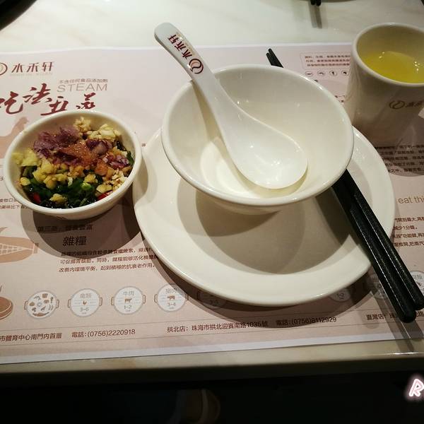 菜品:蒸汽火锅是在下面的锅里放上适量的米和水(也就是食客所点的粥底),上面架上蒸盘用来蒸制食材,食材蒸制过程中渗出的汁水会进入下面的粥,等菜吃得差不多了,就撤掉蒸盘,下面的粥也熬好了,吸收了各种食材的汁水,非常鲜美,一顿饭就以喝粥而愉快的结束。蒸海鲜的口味比较清淡,喜欢重口味的朋友可以把蘸水调制得辣一点。虽然水禾轩不便宜,但是对于不太懂海鲜的外地游客的话,要比去海鲜街点菜吃“安全”很多,海鲜街宰客欺生的太多了~而且水禾轩的环境也比海鲜街的大排档要好很多~对于游客来说,偶尔一顿,水禾轩确实是不错的选择。