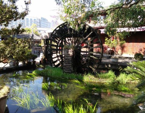 ...拱桥,在流水作用下不停翻转的水车,或单株或成林的小竹林,盛开的三角梅比比皆是,一派江南水乡美景