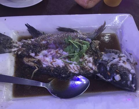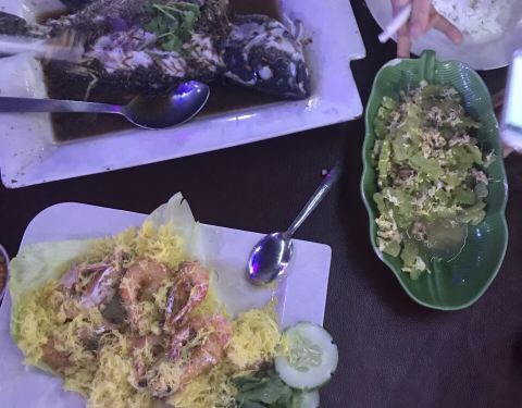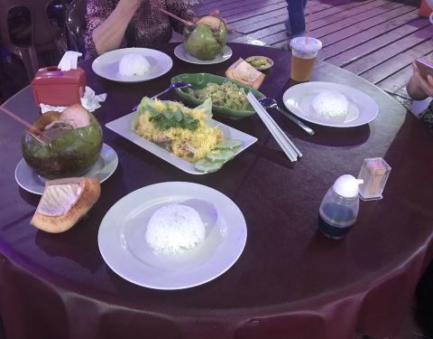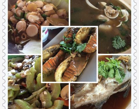 海鲜清蒸红鱼,奶油虾,冰冻椰子,蟹肉苦瓜。点了几个菜,每人平均一百人民币左右。环境很拉风,海风很凉爽。海鲜都很新鲜,米饭也还行。但是只收现金,不能刷卡。