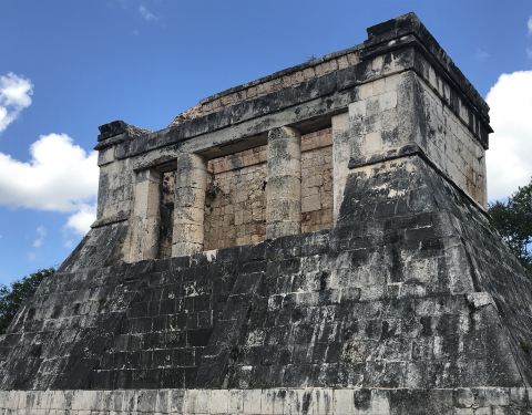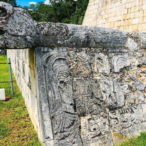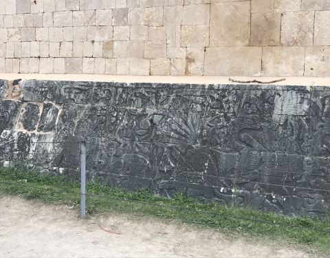 奇琴伊察古迹上面刻的很多画都有着不一样的故事。从球场的这个方向可以把奇琴伊察的经典地方拍到球场Gran Juego de Pelota