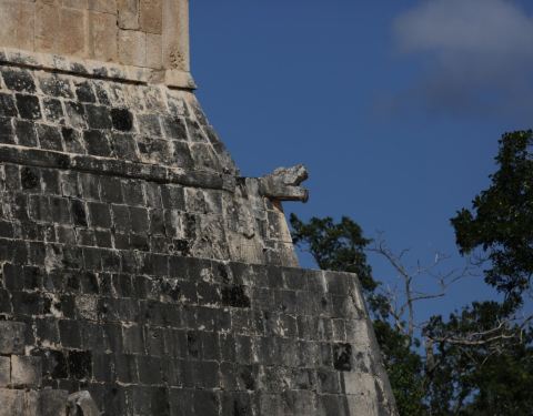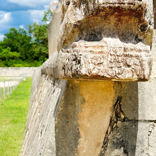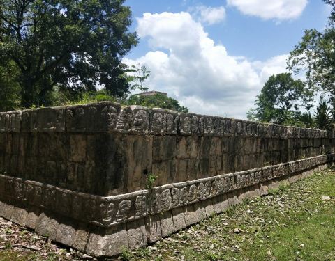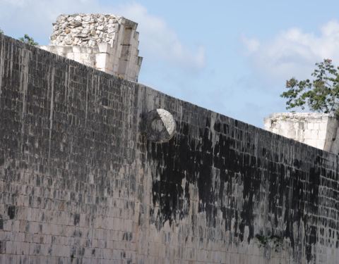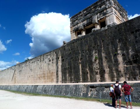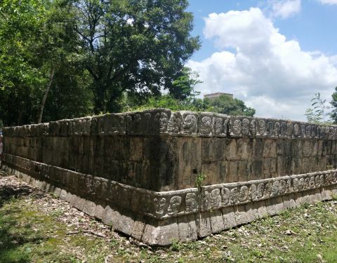 位于奇琴伊察金字塔一侧的球场是除了金字塔之外最吸引人的地方了,除了建筑保存相对完整,另一点就是很难想象古代玛雅人如何可以不用手只通过腰、肘等部位把球射入球门,更难以想象的是,据说庆祝胜利的祭祀品是胜利一方队长的头颅,这个实在是颠覆了我的想象。如果是失败一方的头颅,还可以理解,只不过认为比较野蛮血腥罢了。