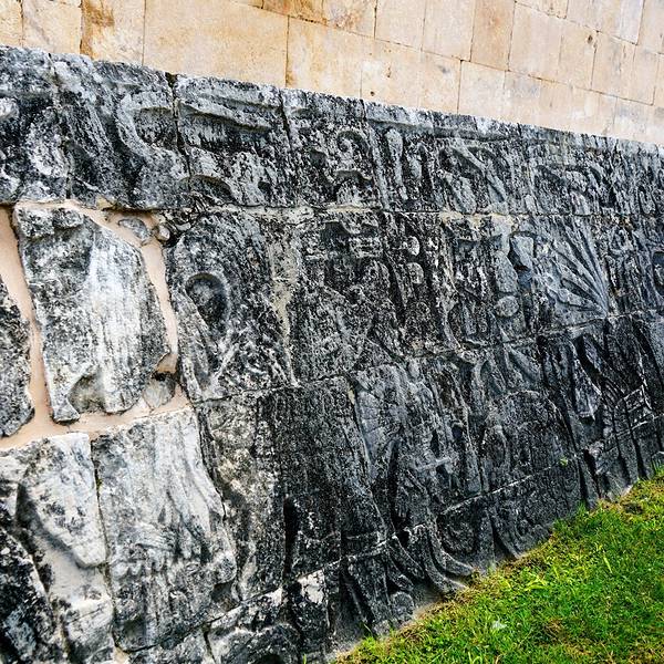 在奇琴伊察古城的另外一侧有一个比较大的平台,这里就是玛雅人的足球场,也是中北美洲最大的古足球场,不过他们的玩法跟现代足球有点不一样,那个龙门是在上面的,要提进去也有点难度。 旁边就是一些墙壁,还有神庙墙壁上面会有一些骨头,还有一些小图案显示的,当时的这种竞赛的情况。 有两种说法,一种是胜利的话,队长就会被砍头祭天,另外一种说法就是失败了的话就会被整队砍头惩罚。
