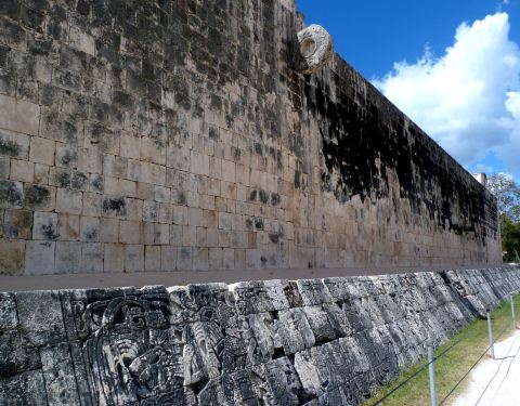 球场有166米长68米宽,是古代中美洲最大的球场,也是墨西哥最大、最最吸引人的球场,它只是城里的8个球场之一,显示了在这里进行比赛的重要性,球场的两端都有神殿,以高耸的墙壁为界,高处有石制圆环,老实说这个环挺小的,而且很高,要想踢进去还是有一定难度的。在托尔特克时代,失败方的队长,也有可能连同他的队员一起会成为牺牲品,知道了规则,再参看这个石圈的直径和高度,就知道比赛难度有多大了,当然奇琴伊察的球场是最大的,石圈也是最高的,估计适用于超级联赛,总算明白为什么中美洲和南美洲的球类活动水平那么高了。沿着球场的石墙上有石雕,有球员被斩首、鲜血四溅的场景。