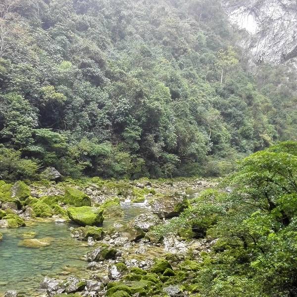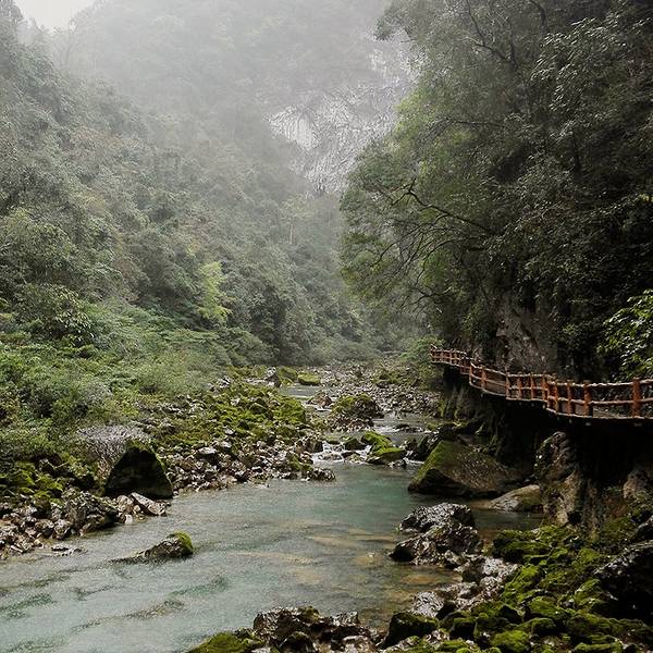 我们估计是景区最早的几拨游客之一,所以步行在栈道上感觉周围格外清静。最美的峡谷,在雨天