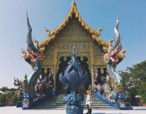 清迈古城开车到蓝庙要一个小时,但是请相信我,决定值得一去!评为泰国最美的寺庙之一,也毫不为过