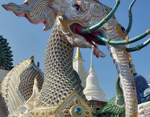 清迈古城开车到蓝庙要一个小时,但是请相信我,决定值得一去!评为泰国最美的寺庙之一,也毫不为过。在蓝庙,你可以看到非常多奇特的动物雕塑,它们看起来“四不像“。