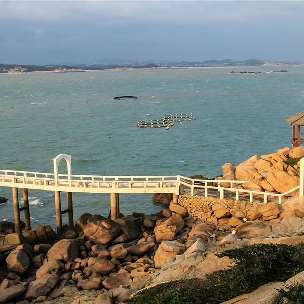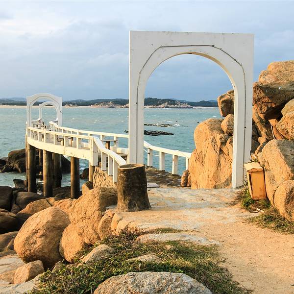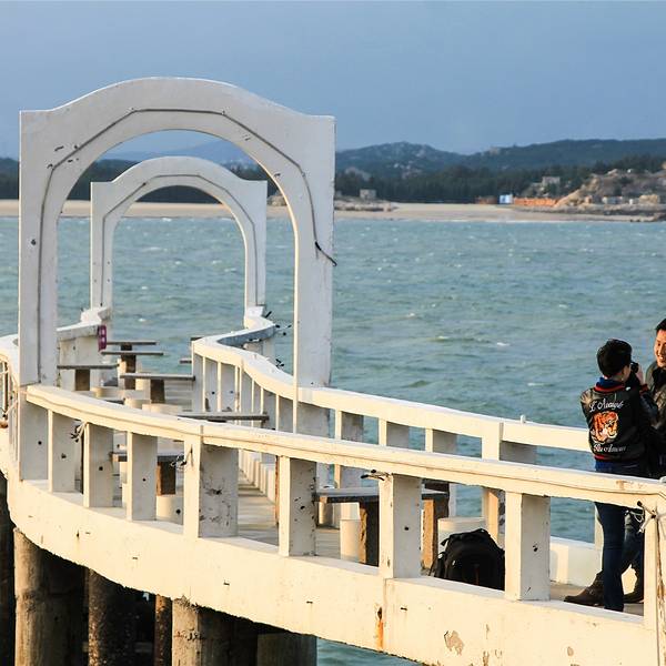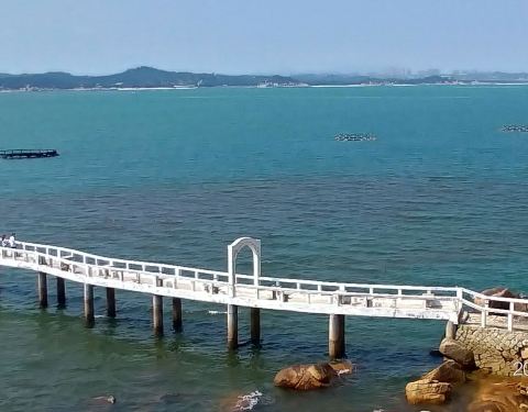 白色的栈道搭建在蔚蓝的海平面上唯美浪漫,最适合情侣走在上面漫步。奇异的岩石让人感叹着大自然的鬼斧神工从清境石厝驱车10分钟左右就能到达平潭岛的大福湾。
