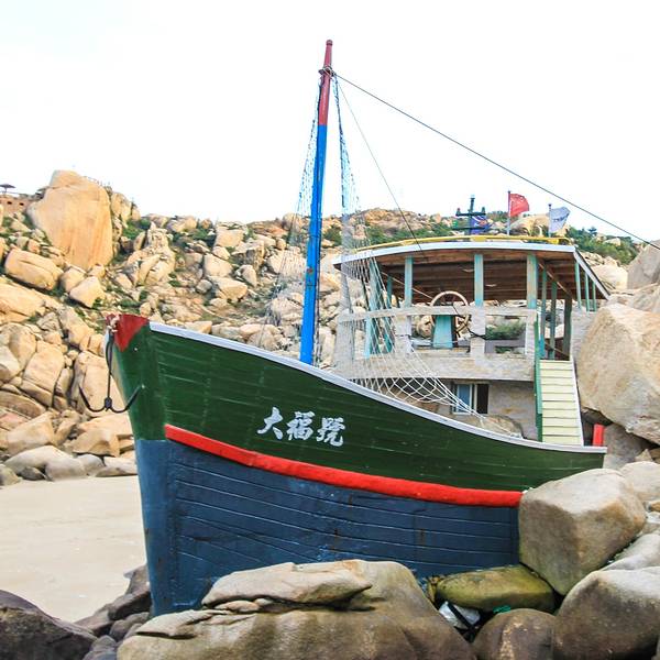 这里主要是渔港,现在是休渔期,停靠着大大小小的渔船。渔民们在修理着船和各种浮标等。大福湾的沙滩一般般吧,沙子肯定是细腻,金黄色的。