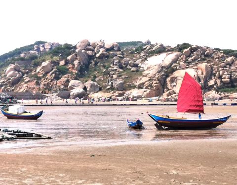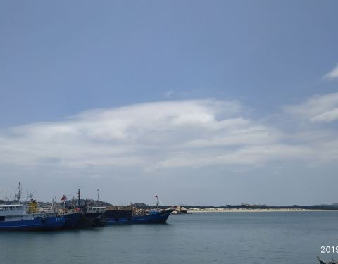 大福湾的沙滩一般般吧,沙子肯定是细腻,金黄色的。这里主要是渔港,现在是休渔期,停靠着大大小小的渔船