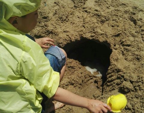 小朋友激动啊,到沙滩后狂挖坑记得墨镜必备,小朋友也要备墨镜的。停车场很大,当然车也很多
