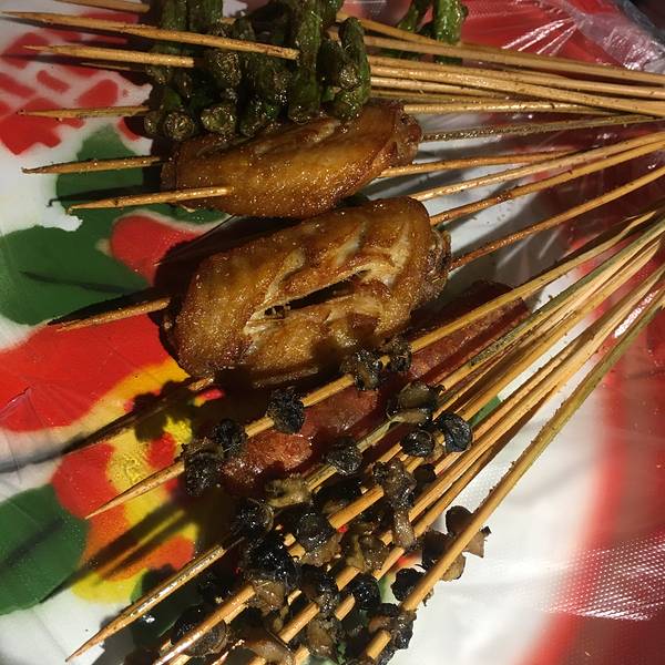 板凳木桌水泥地,吆喝喧嚣真给力。 待烤的翅尖,粒粒分明的炒饭,便宜多样的烤串,令人垂涎的鲜香扑鼻..…
