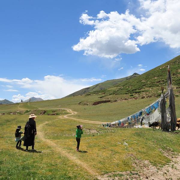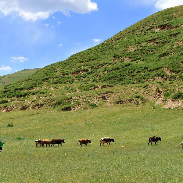 稍大一点的男孩把牛群往更高的山坡上赶。附近的山坡草地上,一位母亲带着两个孩子在放牛