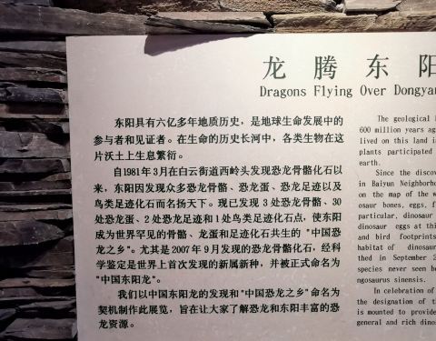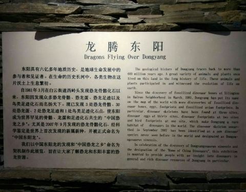 东阳博物馆是免费开放,集收藏、陈列、研究于一体的综合性博物馆,现有馆藏文物28000多件。馆内设“龙腾东阳恐龙展”固定展览,东阳是恐龙之乡。恐龙展厅占一半左右,以“中国东阳龙”的发现、发掘、清理、复原为主题,系统介绍恐龙这类远古生物在东阳的生活情景,以及与恐龙有关的科普知识,有所收获。