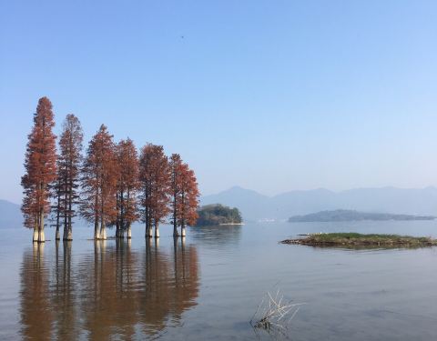 这里虽不是最美的时候,也还是看得到大自然的惊艳,湖是纯净的蓝,天空也蓝的很通透我们来的确不是时候,四明湖的水进入枯水期,红杉树也还没开始泛红。这里虽不是最美的时候,也还是看得到大自然的惊艳,湖是纯净的蓝,天空也蓝的很通透。