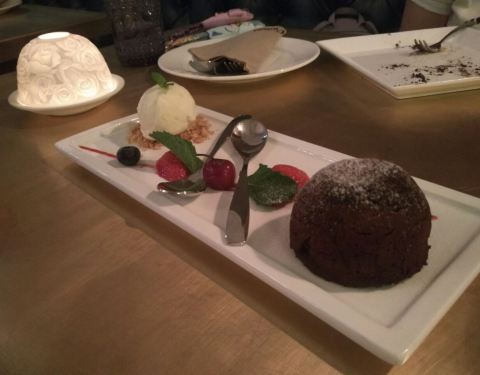 环境很赞,昏暗的灯光和精致的布置显现出高贵的英伦范儿,晚上去的叫了两份甜品,巧克力熔岩做的很不...