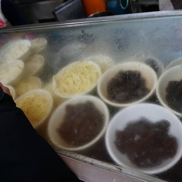 大学同学娟儿就是太原本地人,跨越13个小时的时差指导我如何玩耍。因为只在太原待一个晚上,所以只安排了食品街和柳巷,从太原站打车到食品街只要9元。虽然又冷又不是周末,街上人也不算少呢,据说食品街历史悠久,不过现在夜市上卖的小吃到处都差不多了。娟儿介绍说一定要吃灌肠,我们只在食品街上看到两家,看这家“杨记灌肠”人比较多就进来了,没想到还是大众上排名第三的“名店”,娟儿也说是她的最爱。听名字我还以为灌肠是要灌一些肉到面食里去,没想到就是荞麦面做的面块块,6元一碗的素食。
